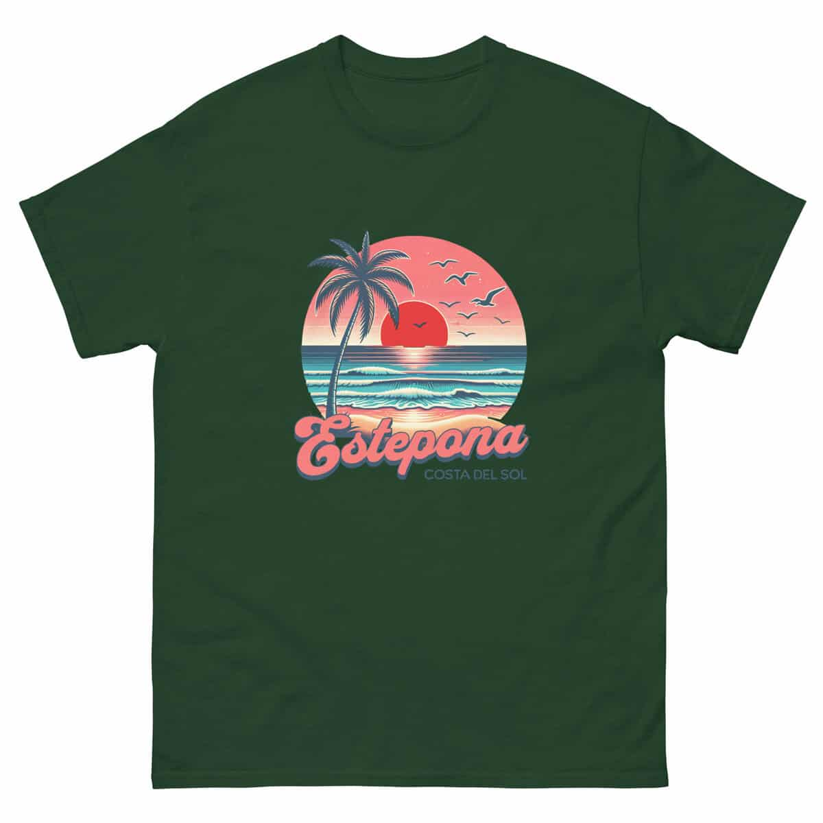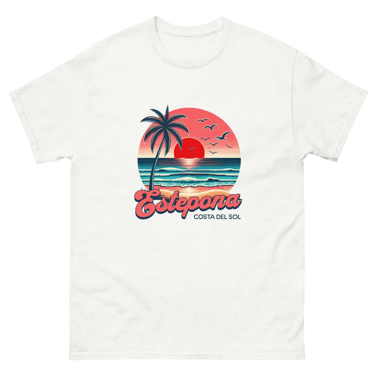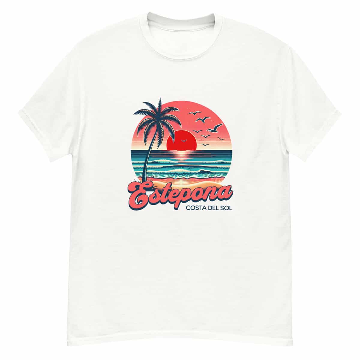 Ride the waves of nostalgia with this vibrant retro-style Estepona tee. Featuring a glowing red sun, palm trees, pastel skies, and rolling waves, it captures that perfect Costa del Sol moment — golden hour by the sea. Ideal for sunset chasers, beach lovers, and anyone vibing with coastal cool.